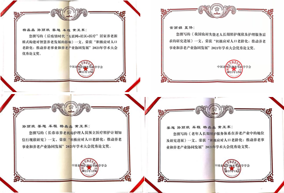 同时,我院2019级研究生孙丽欣撰写的论文《长春市养老机构护理人员预立医疗照护计划知信行现状研究》、2019级研究生夏佟撰写的论文《老年人长期照护服务体系在养老产业中的地位及研究进展》、2020级研究生姜旭撰写的论文《老年人长期照护服务体系在养老产业中的地位及研究进展》、2021级研究生杨晶晶撰写的论文《后疫情时代“互联网+社区+医疗”居家养老新模式构建对智慧养老发展的影响》荣获2021年学术大会优秀论文奖。