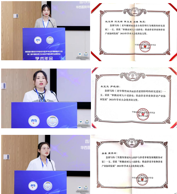 我院2019级研究生赵玉倩撰写的论文《老年糖尿病患者自我管理行为现状的研究进展》、尹晓彤撰写的论文《老年慢性病共病患者述情障碍的研究进展》、2020级研究生房鑫撰写的论文《失能失智老年人照护与养老事业发展现状及对策》均在大会进行学术论文汇报,其报告论文视角新颖、内容丰富,得到了与会专家学者的认可,获得优秀论文并入选总会论文集。