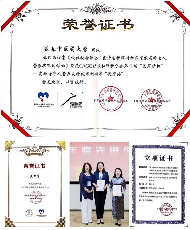 会上,刘玉锦教授及黄卫东教授被授予了由中国老年学和老年医学学会颁发的“2021年度CAGG护理和照护分会先进个人奖”,表彰其为青年学者培养方面付出的努力及为中国护理和照护领域做出的杰出贡献。同时,beat365中国官网团队项目《穴位按摩联合中医情志护理对社区居家高龄老人营养状况的影响》荣获“第三届爱照护杯—高龄老年人营养支持技术创新赛”团队优秀奖;黄卫东教授团队项目《老年护理与照护健康行动之优化路径后前庭康复训练对老年人突发性聋伴眩晕患者康复效果研究(2021—2025》被批准为中国老年学和老年医学学会第一批行动项目。