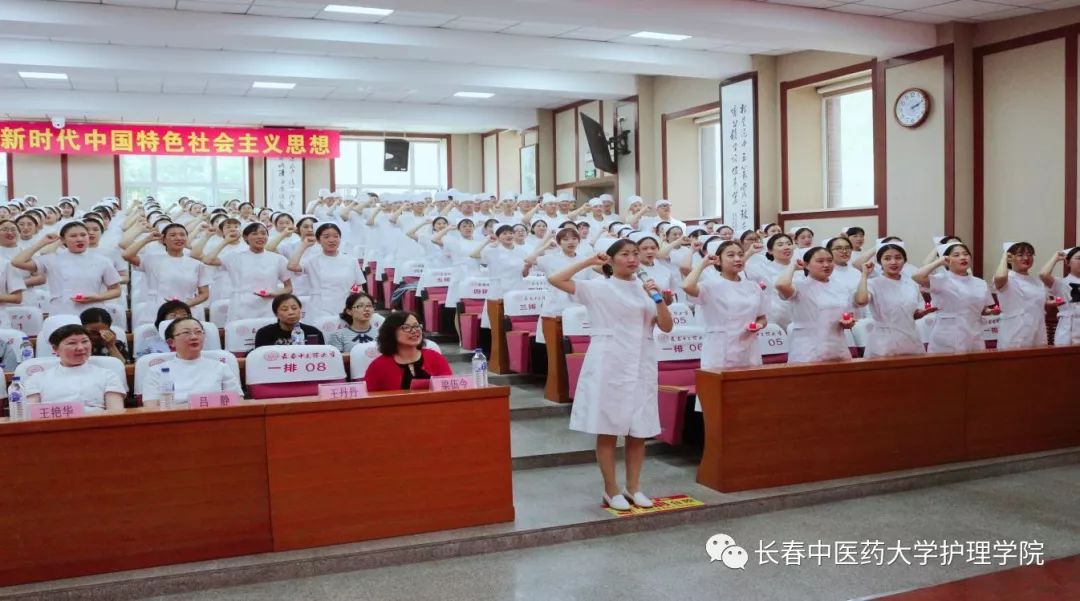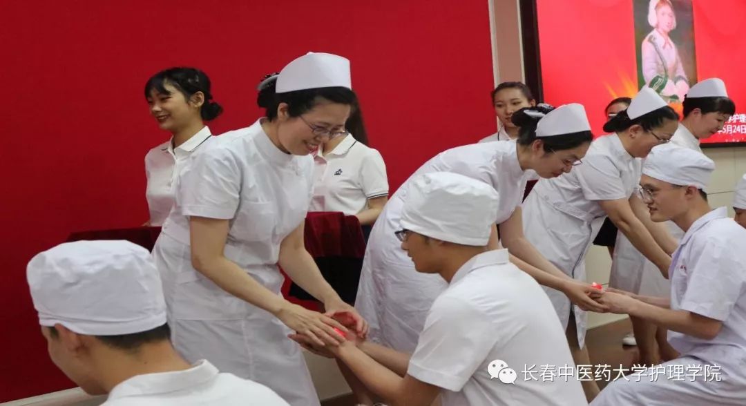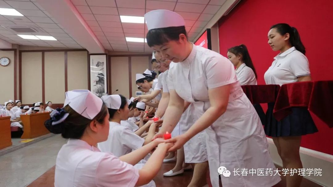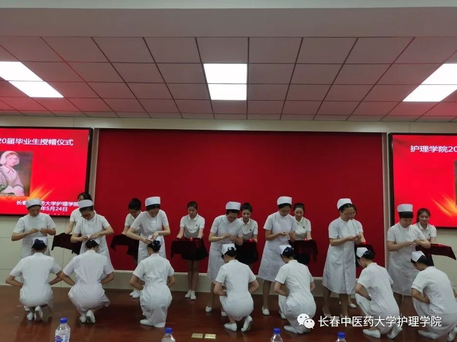随后,七位护理专家为即将走上实习岗位的学生戴上了洁白的燕帽。护生们满怀激动的心情,身着洁白的护士服,挽起整洁的发髻。前辈们将圣洁的燕尾帽戴在他们头上,整理端正。护生们用鞠躬礼表达他们深深的谢意,并接过前辈手中象征“燃烧自己,照亮他人”的奉献精神的蜡烛。在领誓老师王丹丹的带领下,所有同学在南丁格尔像前庄严地许下自己无悔的誓言,大家立誓用爱守护生命,用行动践行南丁格尔精神,献身护理事业,掷地有声的誓词表达了2020届全体毕业生为护理事业奋斗毕生的决心。随后,韩春雨同学作为学生代表发言,她代表2020届全体毕业生表达了对母校的深厚感情和对老师们辛勤培养的感恩,并承诺将积极投身于祖国医疗卫生事业,用爱心与耐心服务每一位患者。