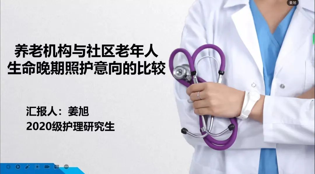 姜旭同学分享的文献为《养老机构与社区老年人生命晚期照护意向的比较》,他主要从老年人生命晚期照护的研究背景和研究意义、文章数据处理方法、测量工具、研究结果对未来护理工作的启示等方面进行分享。通过他的分享让同学们了解了使用倾向性评分匹配方法进行数据处理以及不同养老模式下老年人生命晚期照护意向的差异。
