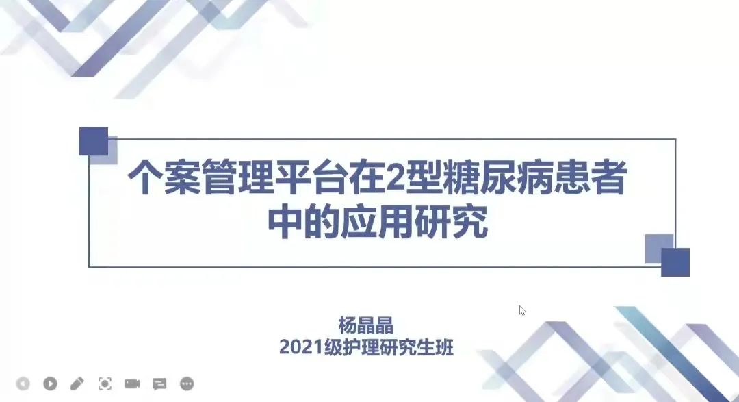 杨晶晶同学做了关于《个案管理平台在2型糖尿病患者中的应用研究》的文献分享,主要从糖尿病患者自我管理的研究背景、相关测量工具、个案管理平台的应用过程及效果等方面进行了讲解。通过她的分享,同学们了解了数字化医疗平台与慢病管理的有效结合,为日后相关学习和写作提供了很好的思路。