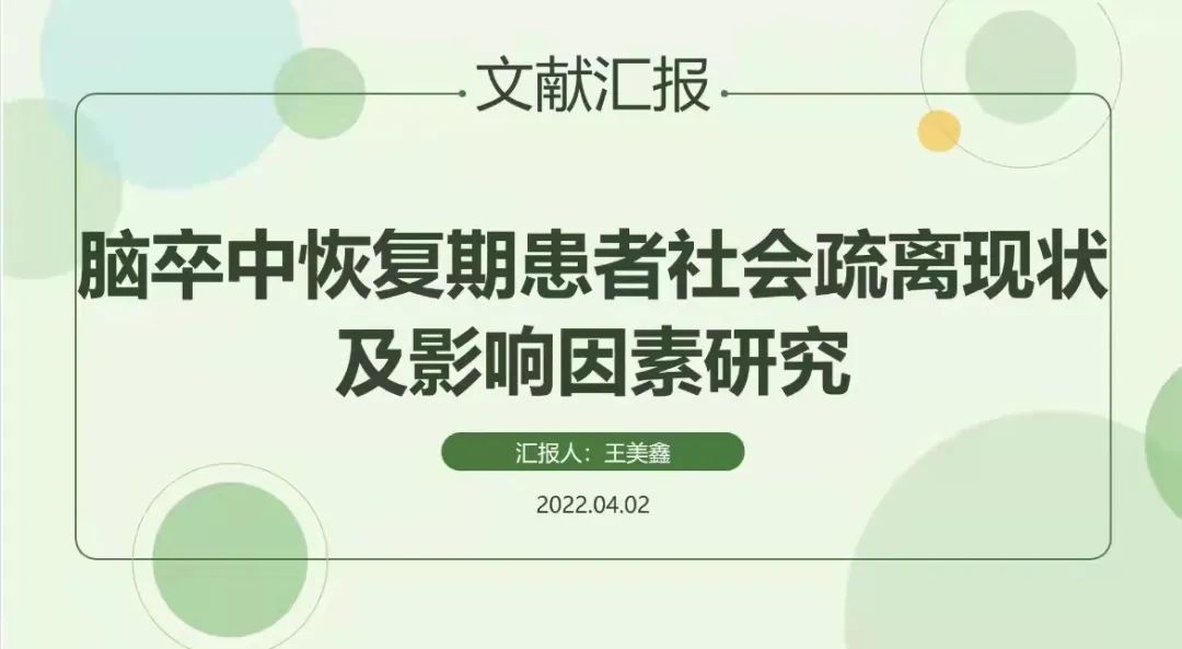 王美鑫同学分享的文献为《脑卒中恢复期患者社会疏离现状及影响因素研究》,她主要从社会疏离的定义、脑卒中患者社会疏离的现状、社会疏离的影响因素以及未来护理应该如何做来降低患者的社会疏离水平等方面进行了分享,并提出了该领域今后的研究趋势。通过她的详细论述同学们对社会疏离有了进一步的认识,激发了同学们深入探索的兴趣。