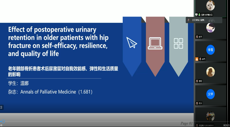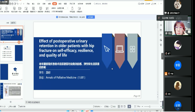 温娜同学分享的文献为《Effect of postoperative urinary retention in older patients with hip fracture on self-efficacy, resilience, and quality of life》,她从该文章的选题意义出发,重点讲解了文章所用相关量表的内容及评分标准、老年髋部骨折术后尿潴留患者自我效能与弹性、生活质量的相关度大小、文章存在的局限性。通过分享同学们了解到患者的心理弹性水平对患者康复质量的重要性。