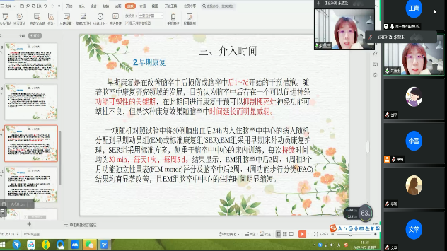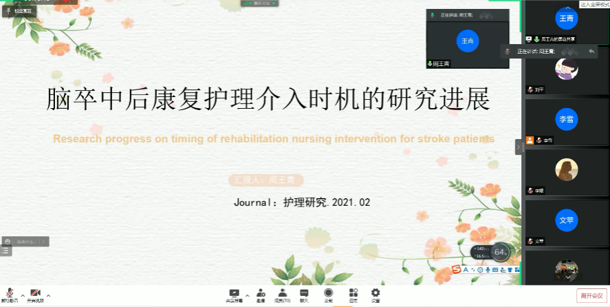 周王青同学分享的文献为《脑卒中后康复护理介入时机的研究进展》,主要从脑卒中的流行病学、康复对脑卒中患者结局的重要性、各个介入时期的划分及各自特点进行汇报,同时也向大家分享了她的心得,建议大家根据文献中重点内容并结合自己的研究方向作为创新点,为之后毕业论文书写提供思路。
