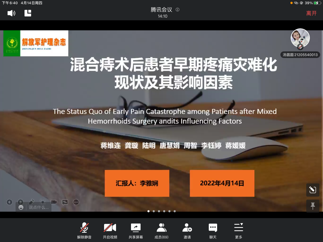 李雅娴同学分享的文献为《混合痔术后患者早期疼痛灾难化现状及影响因素研究》,她主要从疼痛灾难化的概念、统计学方法、相关测量工具及评分标准、混合痔术后患者早期疼痛化现状及其影响因素等方面进行分享。通过她的详细论述,同学们对疼痛灾难化有了进一步的认识,激发了同学们深入探究的兴趣。