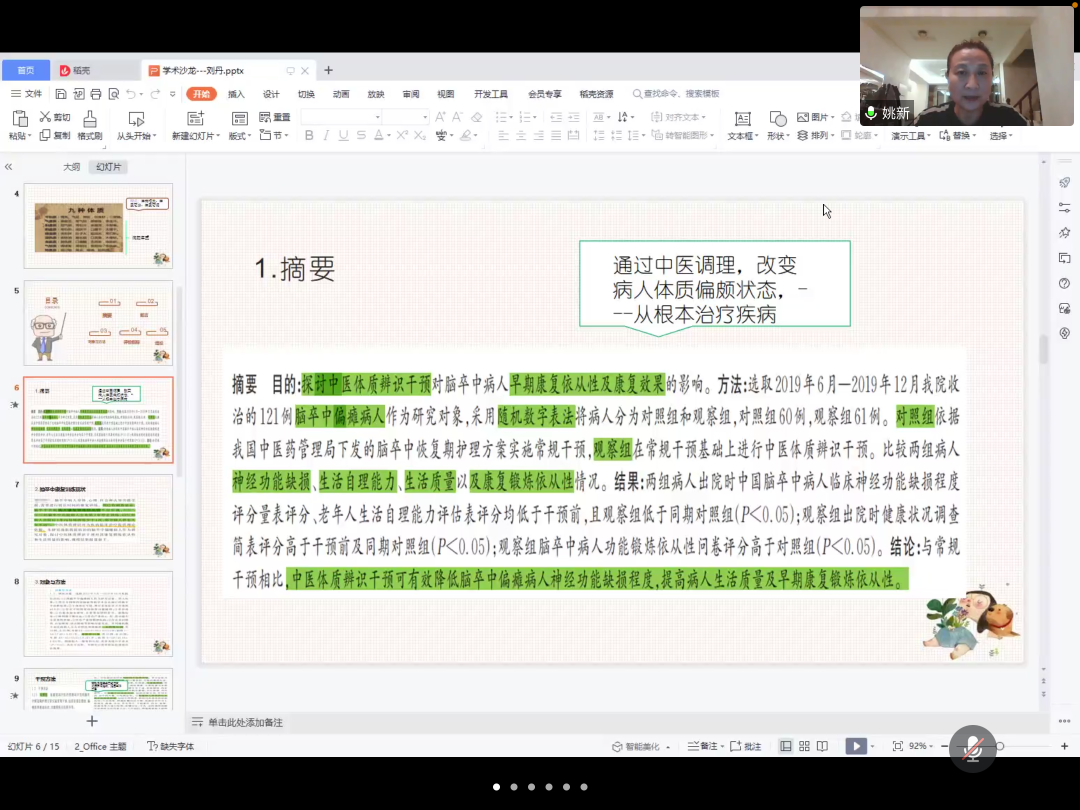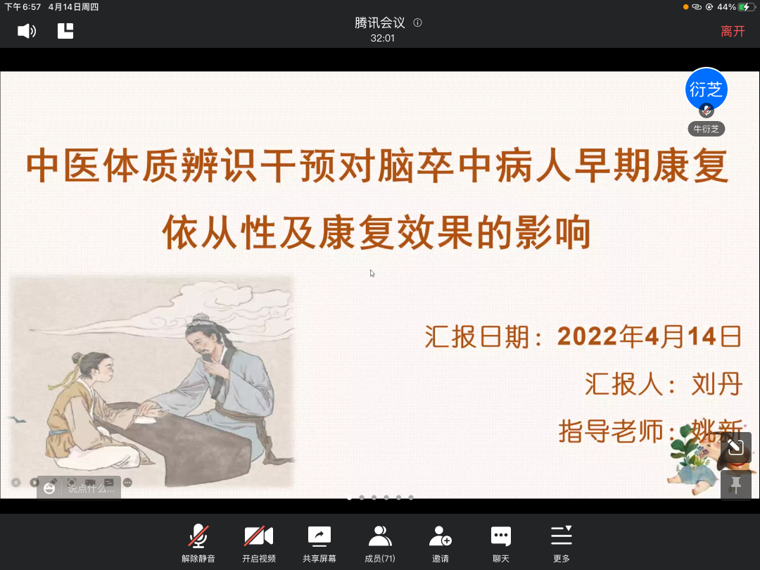刘丹同学做了关于《中医体质辨识干预对脑卒中病人早期康复依从性及康复效果的影响》的文献分享,主要从中医体质学说的内容、脑卒中康复训练现状、相关测量工具、研究结果对未来护理工作的启示等方面进行了讲解。通过她的分享,同学们了解了中医辨识体质干预在脑卒中患者中的应用,为日后相关学习和写作提供了很好的思路。