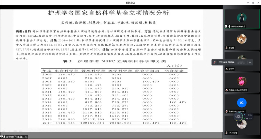 讲座过程中,周教授对护理国自然的现状分析、基础研究对护理学科的影响、护理学科国自然研究的趋势及建议三个方面进行了深入、细致的讲解和探讨,对护理国自然项目的选择与未来的大方向做了深入分析。讲座后部分参会师生与周教授进行了交流探讨。