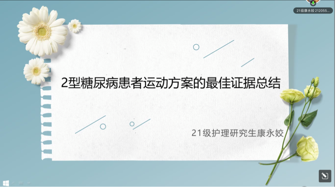 康永姣同学分享的文献是关于《2型糖尿病患者运动方案的最佳证据总结》,通过检索、评价、整合2型糖尿病患者运动方案的最佳证据,为临床制订运动方案提供循证依据;为护士及护理管理者制定护理方案提供循证依据,也为科学管理2型糖尿病患者运动具有指导意义。