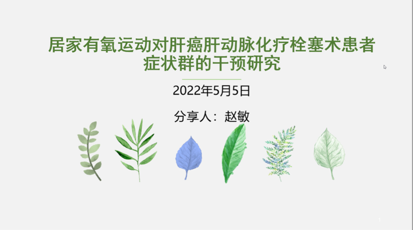 赵敏同学分享的文献为《居家有氧运动对肝癌肝动脉化疗栓塞术患者症状群的干预研究》,文章主要通过回顾国内外文献的研究现状,证明了该症状群的运动疗法在缓解乳腺癌化疗患者中初见成效,本研究为探讨居家有氧运动对肝癌肝动脉化疗栓塞术患者疼痛-疲劳-睡眠障碍及生活质量有着深远的影响。