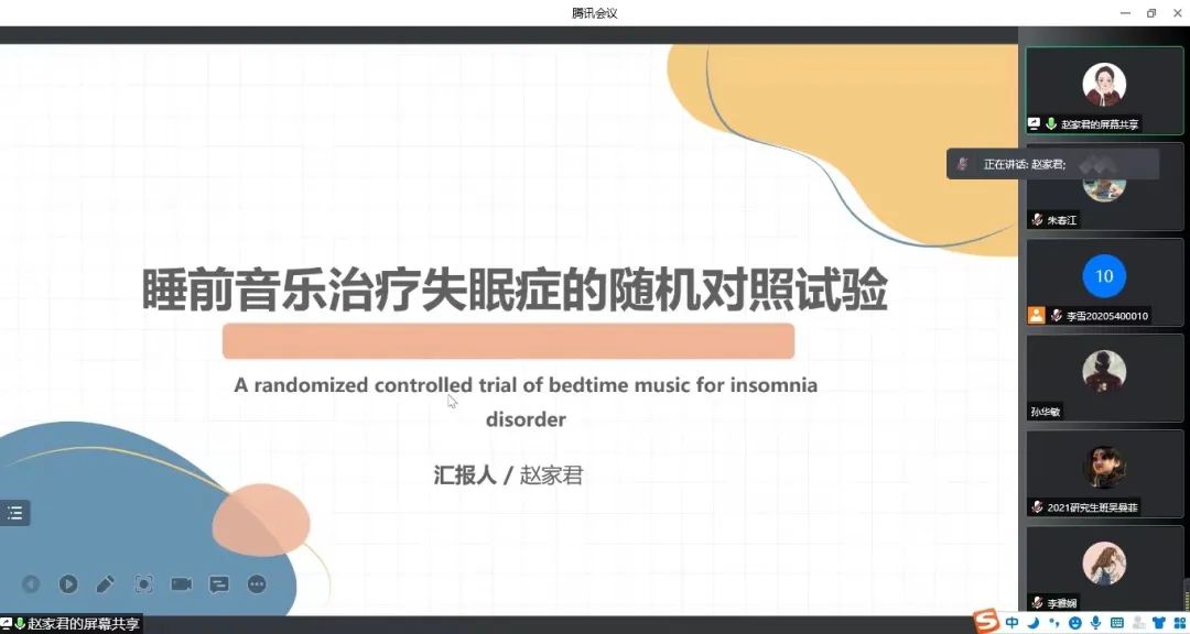 赵家君同学做了关于《A randomized controlled trial of bedtime music for insomnia disorder》的文献分享,通过双盲随机对照试验,以失眠严重程度指数为主要观察指标,评估睡眠质量和生活质量,得出睡前听音乐对睡眠感知和生活质量有积极的影响,但对失眠的严重程度没有明显的影响,还需要进一步的研究来评估音乐对不同失眠亚型的影响。
