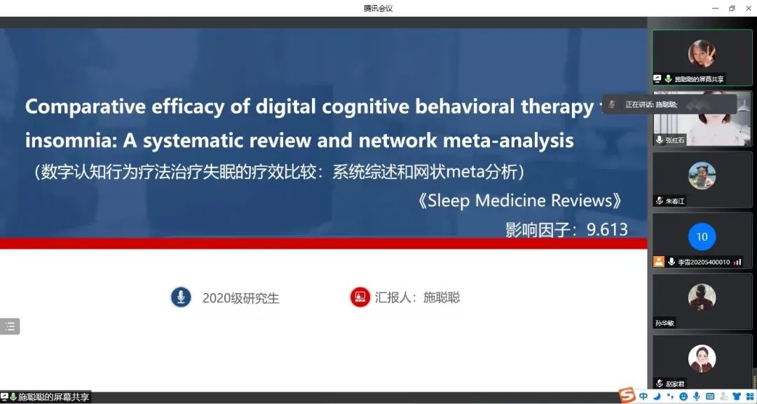 施聪聪同学分享的文献为《Comparative efficacy of digital cognitive behavioral therapy for insomnia:A systematic review and network meta-analysis》,文章主要从失眠现状,失眠认知行为疗法的相关背景,网状meta分析方法,文献检索策略和纳排标准进行阐述,结果发现有治疗师的网络CBT在TST、SOL、WASO、SE和失眠症状方面提供了最佳的治疗效果,面对面互动对数字CBTi的成功起着至关重要的作用。同时也指出,参与者特征和研究特征的异质性可能会降低有效性。