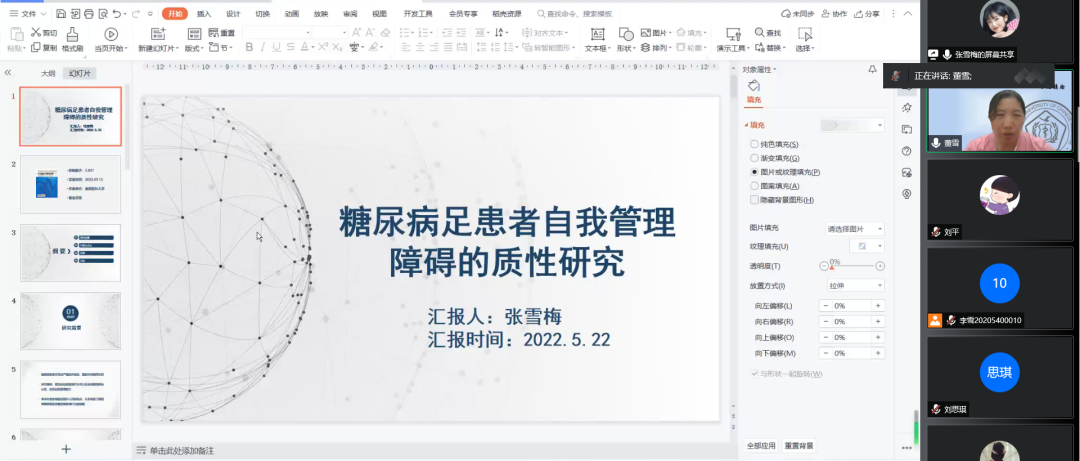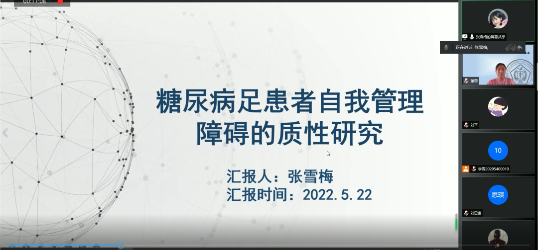 张雪梅同学分享的文献为《糖尿病足患者自我管理障碍的质性研究》,本篇文章对 11 名医护人员及 11 名患者进行半结构访谈,结合患者及医护人员的不同视角,深入探讨阻碍糖尿病足患者自我管理行为的可能原因,护理人员应通过改变患者主观行为认知、降低外界给予的压力以及提供必要客观条件支持等方面促进患者行为意图的改善,以提高患者的自我管理能力,为未来糖尿病足患者防控措施的构建提供依据和建议。