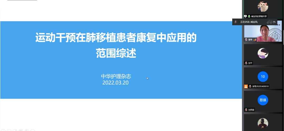 臧金凤同学分享的文献为《运动干预在肺移植患者康复中应用的范围综述》,从范围综述的相关介绍入手,指出范围综述跟meta分析的联系和区别,该文章通过对各大数据库进行检索,最终纳入25篇文章,重点讲解了运动干预的基本内容和纳入文献的基本特征,结果表明运动干预对肺移植患者的呼吸功能、活动能力、生活质量、心理状态都具有积极意义。