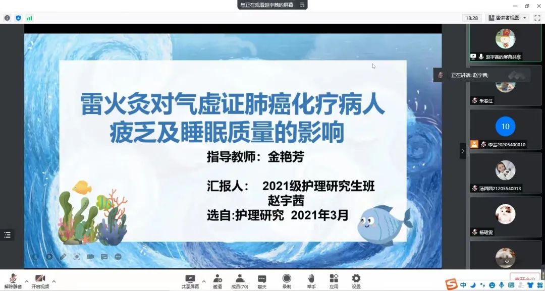 赵宇茜同学做了关于《雷火灸对气虚证肺癌化疗病人疲乏及睡眠质量的影响》的文献分享,文章选取84例患者随机分为两组,对照组采用常规护理,观察组在常规护理的基础上加用雷火灸,比较两组 Piper 疲乏修订量表评分、匹兹堡睡眠质量指数及安全性。得出雷火灸应用于气虚证肺癌化疗病人可改善疲乏状况,提高睡眠质量,且较安全。