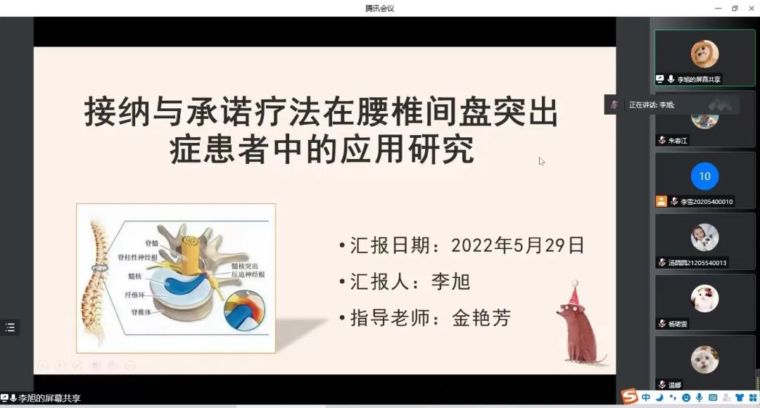 李旭同学分享的文献为《接纳与承诺疗法在腰椎间盘突出症患者中的应用研究》,文章选取203例腰椎间盘突出症术后患者随机分为两组,对照组实施常规护理,观察组在对照组基础上实施接纳与承诺疗法干预,成立干预小组制订接纳与承诺疗法干预方案并组织实施。得出接纳与承诺疗法干预能够降低腰椎间盘突出症术后患者的焦虑水平,提高患者功能锻炼的依从性,并改善患者腰背-下肢功能。