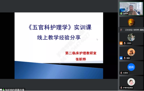 《社区护理学》为国家高等教育智慧教育平台课程、吉林省课程思政示范项目、吉林省精品在线开放课程、校级一流课程、校级课程思政示范课;《五官科护理学》为学校的校级一流课程、校级课程思政示范课,通过两位线上实训课教学经验的分享,使全体教师在课程设计、教学过程、教学模式等方面都有很大收获。