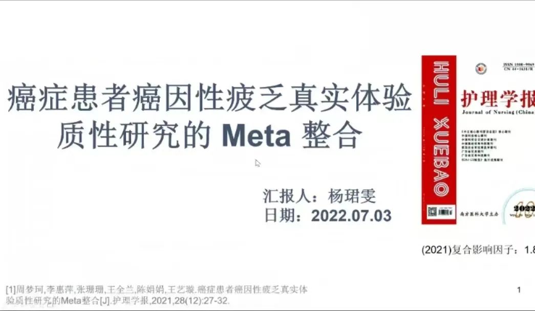 杨珺雯同学做了关于《癌症患者癌因性疲乏真实体验质性研究的Meta整合》的文献分享,通过对癌症患者癌因性疲乏现状的介绍及Meta整合这一概念的解释引出本次分享的主题。文章指出目前国内外虽有相关质性研究,但其研究的关注重点不一,对此,采用汇集性 Meta 整合的方法整合国内外癌因性疲乏相关质性研究结果,旨在临床医护人员制定干预策略提供可靠依据。通过她的分享,同学们了解了meta整合这一写作方法,为日后相关学习和写作提供了很好的思路。