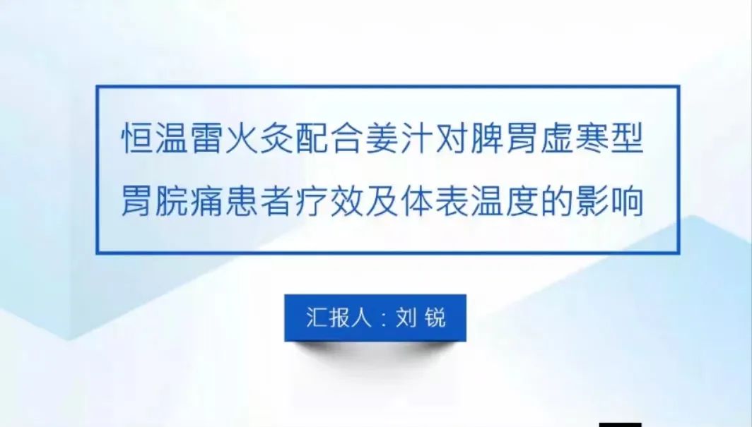 刘锐同学做了关于《恒温雷火灸配合姜汁对脾胃虚寒型胃脘痛患者疗效及体表温度的影响》的文献分享,该研究将80例脾胃虚寒型胃脘痛患者按随机数字法分为恒温雷火灸组和姜汁恒温雷火灸组。在干预前、干预第 7 天和第 14 天观察比较腋温和脾俞、胃俞、中脘、关元、足三里、涌泉等穴位的体表温度。结果表明:恒温雷火灸配合姜汁可显著提高脾胃虚寒型胃脘痛患者临床疗效,同时提高体表温度,改善机体寒性症状。
