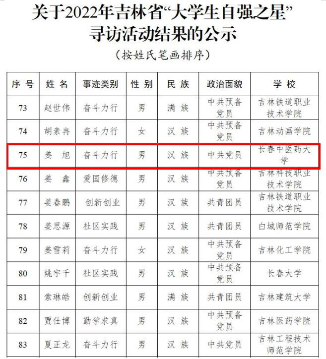 近日,由共青团吉林省委、吉林省学生联合会联合开展2022年吉林省“大学生自强之星”寻访活动,经过层层推荐、严格评选,我院2020级护理学专业硕士研究生姜旭荣获2022年奋斗力行类别吉林省“大学生自强之星”荣誉称号。