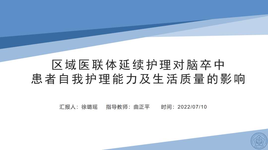 徐璐瑶同学分享的文献为《区域医联体延续护理对脑卒中患者自我护理能力及生活质量的影响》,文章收集153例脑卒中患者,观察组76例,对照组77例,对照组给予常规治疗、护理、健康教育,观察组给予区域医联体延续护理,比较2组间自我护理能力、生活质量量表。结果表明:观察组出院后6个月生活质量评分、自我护理能力显著高于对照组。