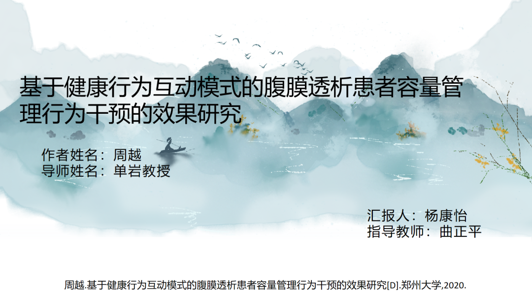 杨康怡同学分享的文献为《基于健康行为互动模式的腹膜透析患者容量管理行为干预的效果研究》,文章通过三个部分进行讲述,第一部分通过问卷调查得出容量管理行为总分与认知评价中的积极评价及担负责任均呈正相关,与疾病不确定感呈负相关;自我效能与容量管理行为呈正相关;希望水平与容量管理行为呈正相关,患者希望总分处于中等水平。第二部分通过性访谈得出容量管理水平低与内在动机缺乏、心理负担困扰、疾病认知偏差相关。第三部分通过类实验性研究得出基于IMCHB的容量管理行为干预可改善腹透患者容量管理行为,提高其自我效能,促进对疾病的积极认知,提高生活质量,减轻水肿症状,对降低干体重作用有待探究。