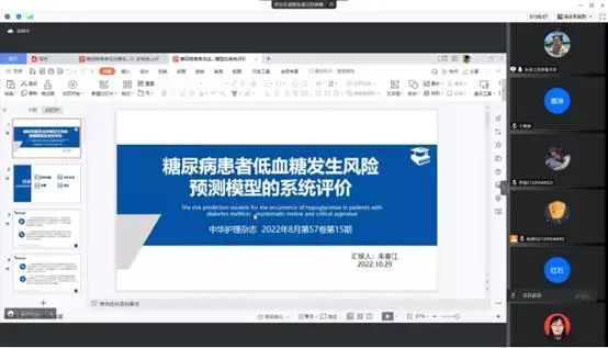 朱春江同学做了关于《糖尿病患者低血糖发生风险预测模型的系统评价》的文献分享,文章系统检索现有低血糖发生风险预测模型的相关研究,按照纳入、排除标准筛选文献后纳入14篇文献,16个低血糖风险预测模型,规范评价其风险偏倚和适用性,旨在为临床医护人员选择或开发适合的风险评估工具提供参考和借鉴,得出低血糖风险预测模型整体呈现良好的区分、校准性能及适用性,但存在显著的方法学缺陷和高偏倚风险的结论。