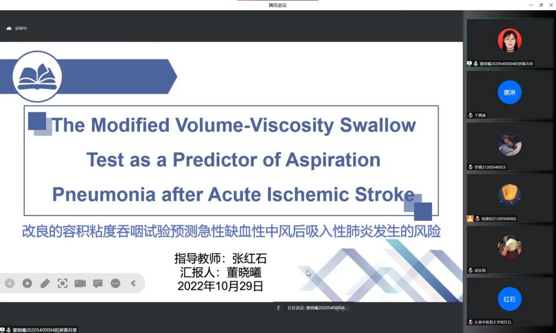 董晓曦同学做了关于《The Modified Volume-Viscosity Swallow Test as a Predictor of Aspiration Pneumonia after Acute Ischemic Stroke》的文献分享,文章通过在入院后24小时内完成改良的V-VST来筛选一年内入院的急性缺血性中风患者,从电子医疗系统和出院记录中获得吸入肺炎的信息,发现吸入肺炎的风险与每种容积粘度有关,3种粘度均受损的患者也被发现与发生吸入肺炎的较高风险相关。得出改良的V-VST是一种简便可靠的筛查AIS患者吞咽困难的工具,基于改良V-VST的患者亚组分析可能能够预测住院期间吸入肺炎的风险的结论。