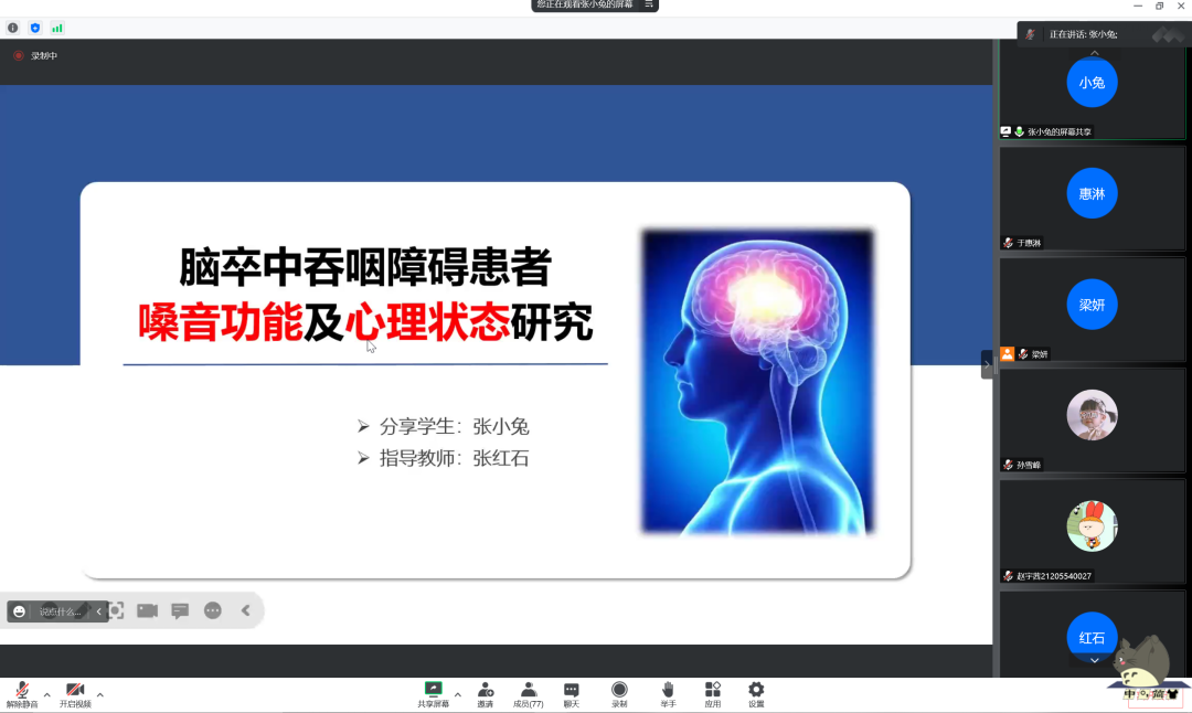 张小兔同学做了关于《脑卒中吞咽障碍患者嗓音功能及心理状态研究》的文献分享,文章通过便利取样法选取337例脑卒中患者,通过洼田饮水试验和标准吞咽功能评估分为吞咽障碍组122例与吞咽正常组215例,比较吞咽障碍与吞咽正常的脑卒中患者嗓音功能及心理状态。得出脑卒中吞咽障碍患者嗓音功能受损及焦虑抑郁情绪显著高于吞咽正常患者,需开展吞咽-嗓音-心理联合康复的结论.