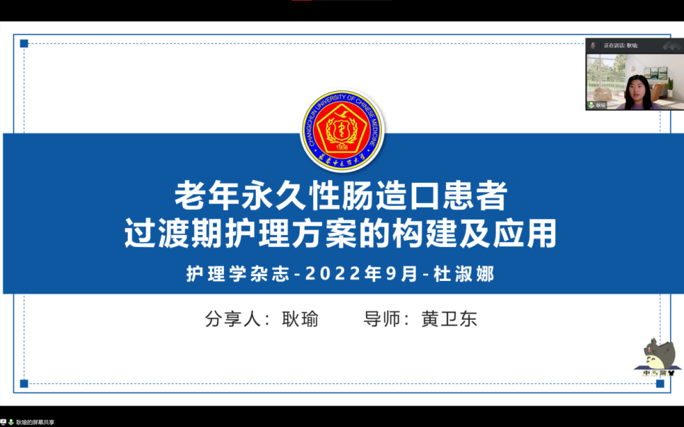 耿瑜同学做了关于《老年永久性肠造口患者过渡期护理方案的构建及应用》的文献分享,文章将88例老年肠造口患者按病区分为对照组与观察组各44例。对照组采用术后常规护理,观察组在常规护理基础上构建并实施过渡期护理方案,比较两组干预前、干预完成时及干预后3个月护理依赖水平、肠造口自我照护行为执行意向评分,构建老年永久性肠造口患者过渡期护理方案并评价其应用效果,得出对老年肠造口患者实施过渡期护理方案,能够降低患者护理依赖水平,增强患者自我护理意向,有利于促进患者康复的结论。