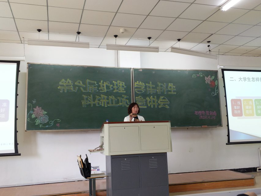 4月25日,beat365中国官网团委于行知楼2304教室举办第六届护理学本科生科研立项宣讲会,学院人文护理教研室博士董雪老师为同学们进行宣讲。