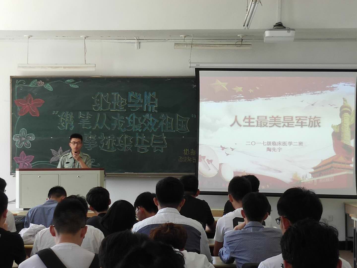 陶先宇,2015年9月1日入学,护理学专业,9月10日保留学籍参军入伍,在装甲兵技术学院服役期间,考取装甲车二级驾驶证,在陆军政治工作网发表文章数篇,担任团队广播员,因工作成绩突出,获“优秀士兵”两次。2017年9月退役,复学后转入2017级临床医学2班,担任临床医学院学生会综合部干事,一年来多次获得奖学金,并在各类演讲比赛中表现突出,在此次事迹报告会上,陶先宇讲述自己从军的经历,从衣食无忧的大学生到经历磨练、荣立功勋的士兵的军旅生活及心路历程。陶先宇激励我院学子要敢于追逐梦想,不负青春,踊跃报名参军、为母校增光添彩,用青春年华谱写人生壮丽篇章。