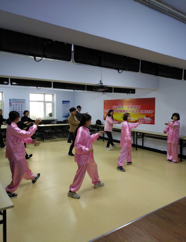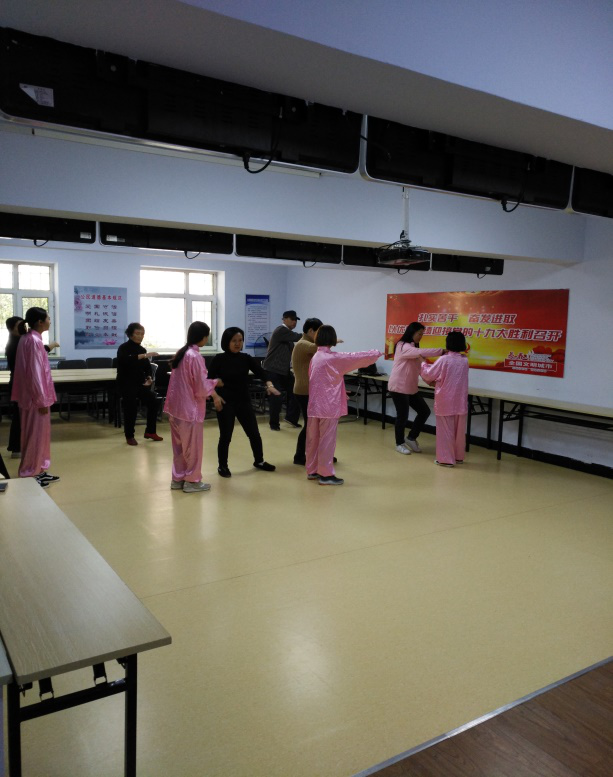 志愿团成员首先为社区居民展示了一套完整的《24式太极拳》,受到了居民们的一致好评。接下来成员们带领大家做准备活动,并教授太极拳的分解动作,对居民们的动作给出了细致的指导,同时叮嘱大家在打太极拳过程中需要注意的事项。