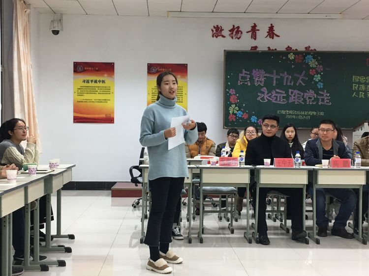 青年委员刘开轩从学习十九大会议精神为同学们分享了自己的心得体会,谈到了应如何做一个坚定的青年马克思主义者。明确指出作为青年一代,学习习近平思想是必不可少的,马克思主义改变了贫穷落后的我们,所以我们更要坚定不移的跟党走。