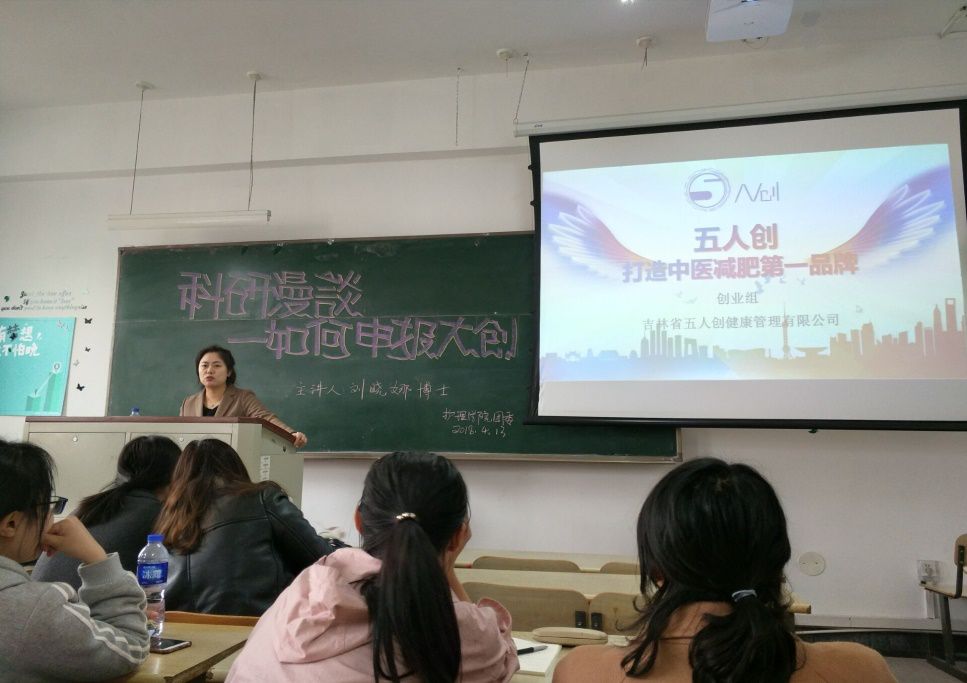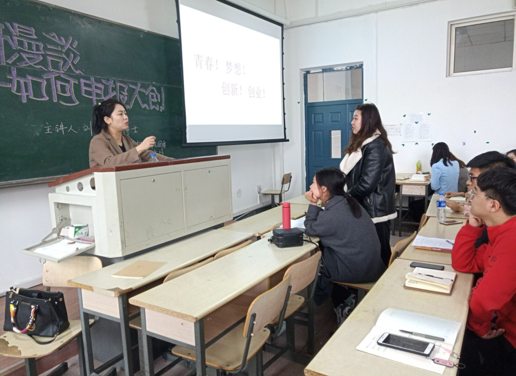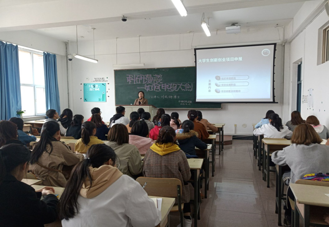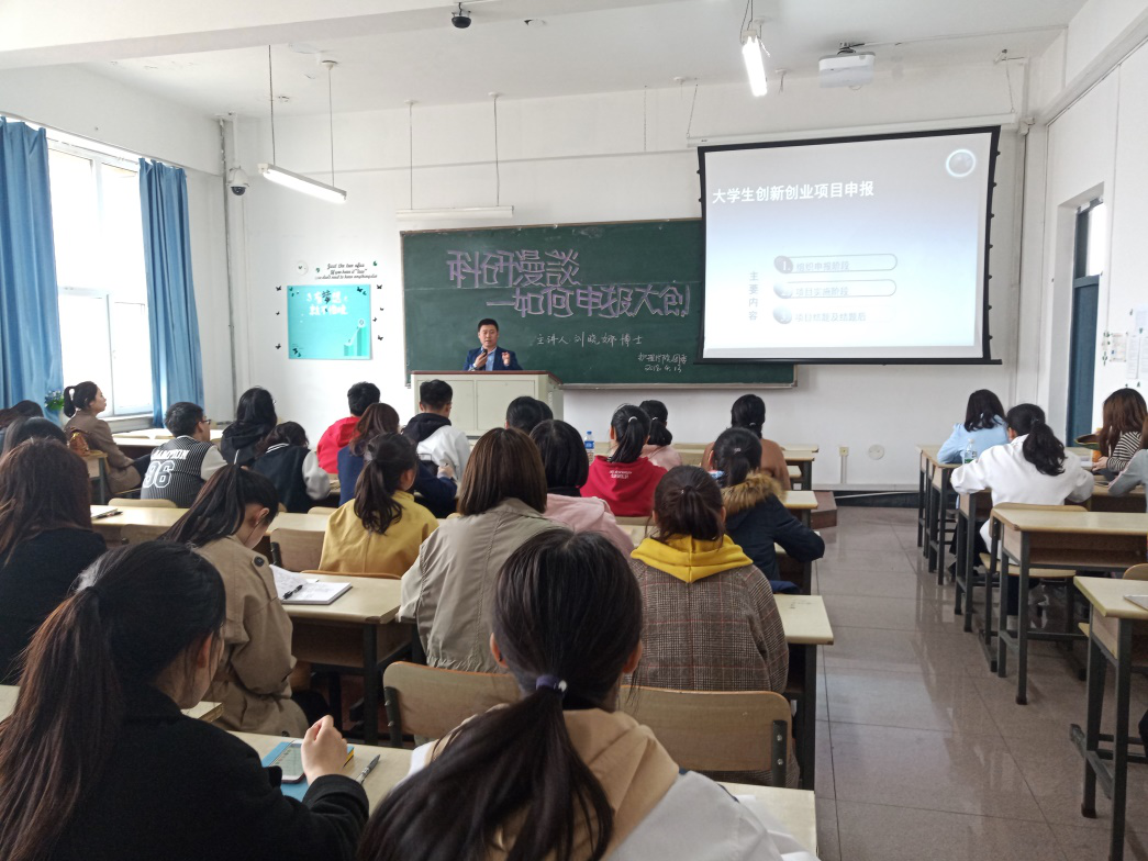 课上,刘晓娜老师从项目选题注意事项、项目申请书的撰写、项目实施、项目结题及结题后资料整理等几方面出发,详细地为学生讲解申报大创的流程及其注意事项,并以三个项目为例进行了具体介绍,最后针对学生提出的学术问题进行耐心细致的解答。