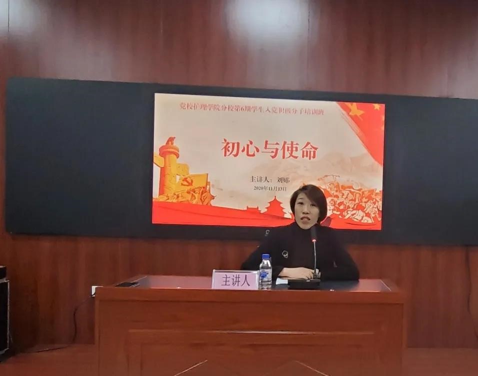 11月13日,党校beat365中国官网分校第6期学生积极分子培训班于四象城3303教室顺利举行“ 初心与使命——‘最美护士’谈岗位建功”专题党课。本次党课邀请吉林省肿瘤医院主管护师/护士长刘娜担任主讲人,beat365中国官网学生工作办公室全体老师及学生入党积极分子130余人参加本次党课。