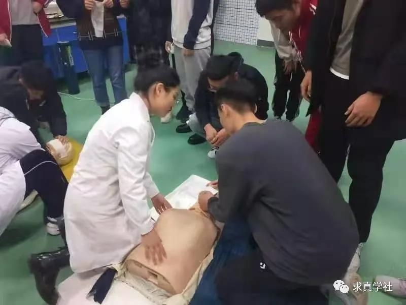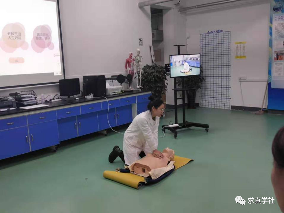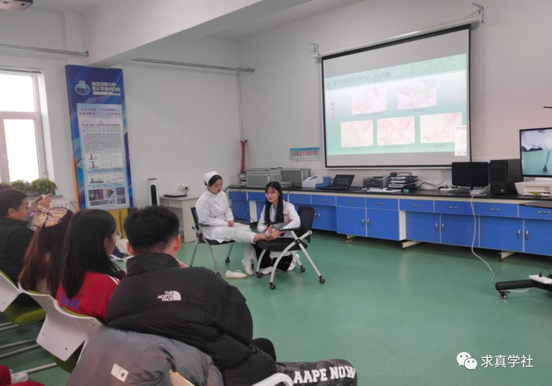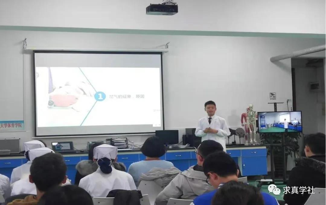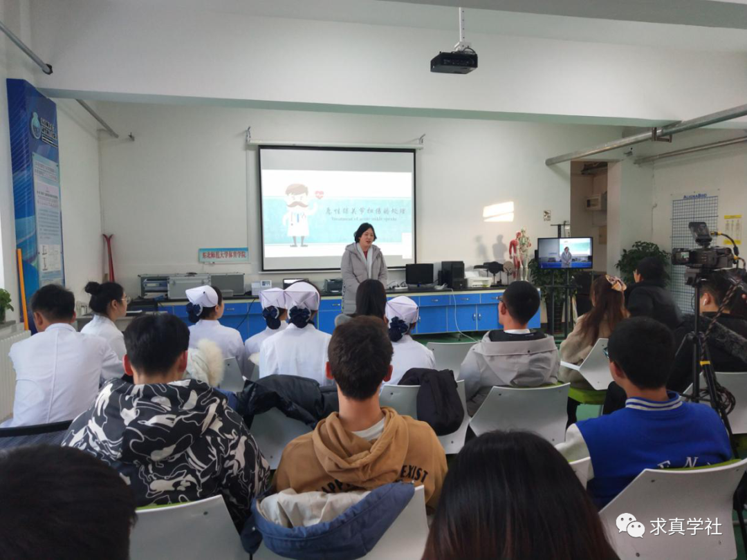 首先,东北师范大学体育学院副院长刘俊一发表讲话,他指出,《“健康中国2030”规划纲要》的颁布标志着“健康中国”展开新的蓝图,“体医结合”也越来越受到重视,对于未来的体育教师、运动训练员而言,常见的突发状况急救是必备技能。杨书记强调两校的交流合作,对双方学生而言是互利共赢的,为更好地提供服务,让学生获取更多的医学知识,今后将尝试建立科普工作坊。随后,三位研究生分别从急性踝关节扭伤的处理、运动中急性腹痛急救护理和运动性昏厥的处理三方面进行讲解,并由我院师生共同指导了学生们的操作练习。