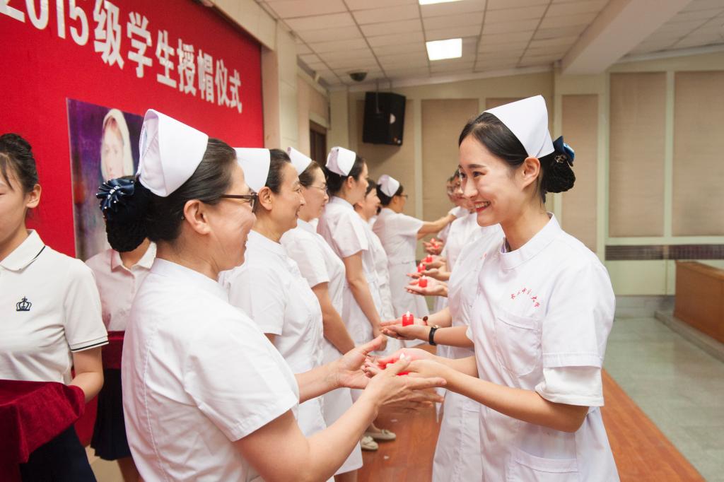 崭新的燕帽,象征着圣洁的天使;火红的蜡烛,象征着“燃烧自己,照亮别人”的南丁格尔精神。伴随着乐曲“平安夜”的优美旋律,2015级193名学生在护理前辈面前戴上燕尾帽、接过红烛,传承南丁格尔精神。在基础护理教研室王洋主任的领誓下,学生们进行了庄严的宣誓,一句句铿锵有力的誓言让大家深刻感受到自己所从事的这份职业的神圣感、使命感和责任感。李晓娟同学作为2015级学生代表进行了发言。