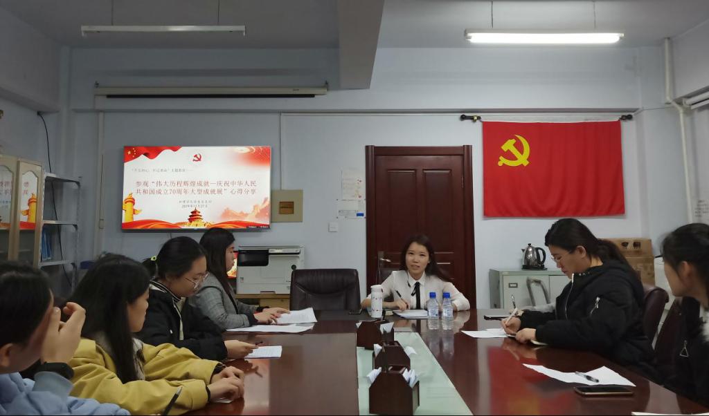 11月27日,beat365中国官网学生党支部在办公楼321会议室召开了“不忘初心,牢记使命”主题教育活动——参观“伟大历程辉煌成就——庆祝中华人民共和国成立70周年大型成就展”心得分享会。会议由党支部书记王雪同志主持。