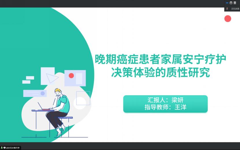 梁妍同学分享的文献为《晚期癌症患者家属安宁疗护决策体验的质性研究》,本文探索晚期癌症患者家属在参与安宁疗护决策时的体验,为制订决策辅助策略提供依据。从晚期癌症患者家属安宁疗护决策体验的研究背景、研究方法、研究结果、讨论四个方面展开了阐述,结论是晚期癌症患者家属在安宁疗护决策过程中的体验复杂,医护人员应不断提高安宁疗护实践能力,有针对性地为晚期癌症患者家属提供决策支持,改善其决策体验,促进安宁疗护的实施。
