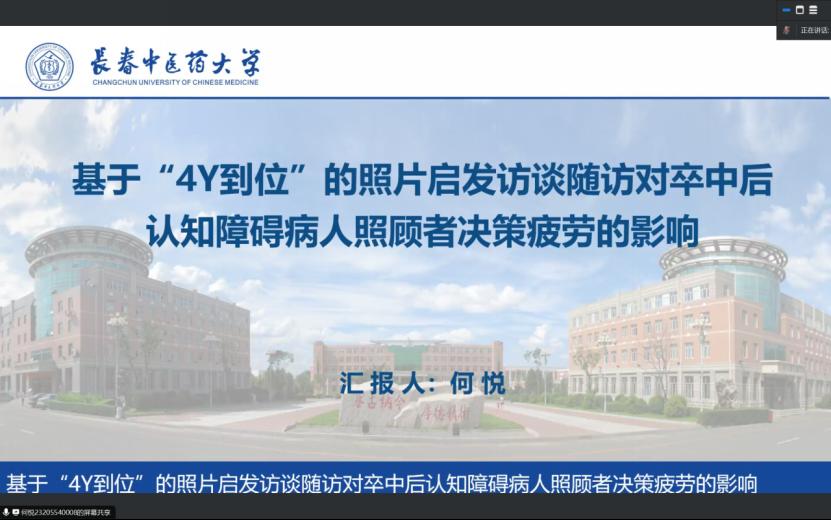 何悦同学分享的文献为《基于“4Y到位”的照片启发访谈随访对卒中后认知障碍病人照顾者决策疲劳的影响》,本文基于计划到位、责任到位、检查到位、激励到位的4Y管理理论,探讨其对卒中后认知障碍病人照顾者决策疲劳的影响,为慢性病家庭照顾决策干预提供参考。从卒中后认知障碍病人照顾者决策疲劳的研究背景、研究方案、研究结果、小结四个方面展开了阐述,结论是基于“4Y到位”的照片启发访谈随访能够有效降低卒中后认知障碍病人照顾者的决策疲劳。