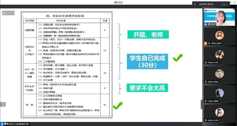 首先张红石老师围绕撰写毕业论文的目的,使同学们明确本科生毕业论文的重要性,使学生能够具有基本的科研能力及创新能力,具有研究护理问题的能力,熟悉科学研究的基本程序和方法。掌握撰写毕业论文的能力。