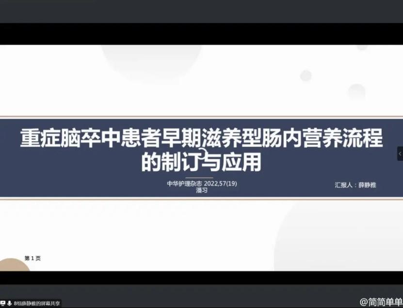 薛静雅同学分享的文献为《重症脑卒中者早期滋养型肠内营养流程的制订与用》,文章节选自《中华护理杂志》2022年8月第57卷第16期,研究者为进一步评价早期滋养型肠内营养支持流程对重症脑卒中患者的应用效果。通过文献检索、最佳证据总结、专家咨询等方法搜集试验证据。采取便利抽样法,连续选取苏州市某三级甲等医院神经内科病房收治的99例重症脑卒中患者,随机分为对照组和观察组。试验组实施早期滋养型肠内营养流程,对照组实施常规肠内营养支持治疗,对照组住院7d后血红蛋白值较入院时下降(P<0.05);两组住院7 d后血浆白蛋白水平较入院时均降低(P<0.05),但试验组下降幅度低于对照组(P=0.046)。结论 早期滋养型肠内营养流程可降低重症脑卒中患者腹泻、便秘及喂养中断的发生率,并促进其血红蛋白的恢复,减缓白蛋白水平的下降。