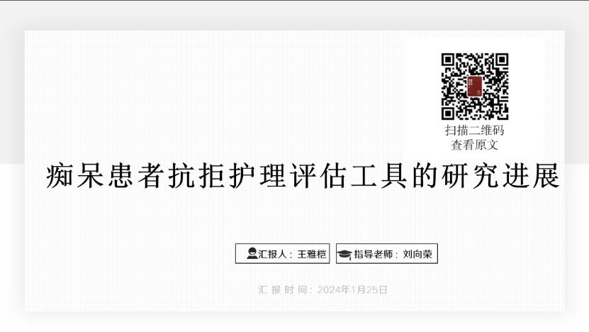 王雅桤同学分享的文献为《痴呆患者抗拒护理评估工具的研究进展》,文献介绍抗拒护理(RTC)是在照护痴呆患者过程中发现的一种常见的异常行为表现,对患者及其照顾者可造成较严重的负面影响。该文献对国外开发的痴呆患者RTC评估工具进行综述,着重探讨不同评估工具在评价内容和方法上的差异,分析其特点、优势和不足,旨在为我国开发或引入适合国情的痴呆患者RTC评估工具提供借鉴。