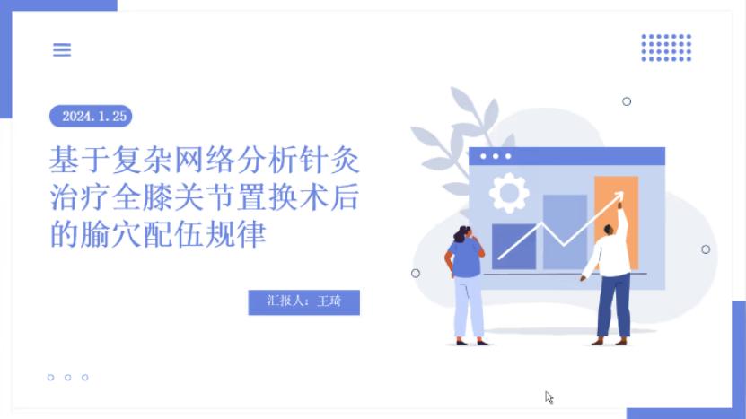 王琦同学汇报的文献为《基于复杂网络分析针灸治疗全膝关节置换术后的腧穴配伍规律》,文献通过检索中国知网、万方数据知识服务平台、维普资讯中文期刊服务平台、Pub Med、Web of Science等数据库2012—2022年针灸治疗TKA术后的临床文献,根据纳入、排除标准筛选相关文献,建立数据库。对腧穴进行频数分析、关联规则分析和复杂网络分析。为针灸治疗膝骨关节炎患者全膝关节置换术(TKA)术后的腧穴配伍规律提供临床参考。