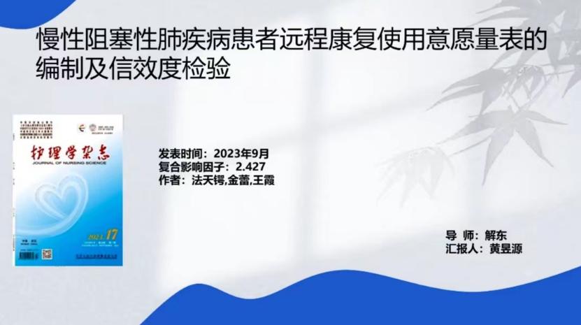 黄昱源同学分享的文献为《慢性阻塞性肺疾病患者远程康复使用意愿量表的编制及信效度检验》,文章以整合技术与采纳模型及健康信念模型为理论依据,结合文献回顾和德尔菲专家函询形成量表的初始条目为研究方法,选取患者 156 例进行问卷调查,对量表进行项目分析和信效度检验。通过专家函询结果、项目分析、效度分析、信度分析对结果进行剖析,明确指出慢性阻塞性肺疾病患者远程康复使用意愿量表具有良好的信效度,可作为 COPD 患者远程康复使用意愿的评估工具。
