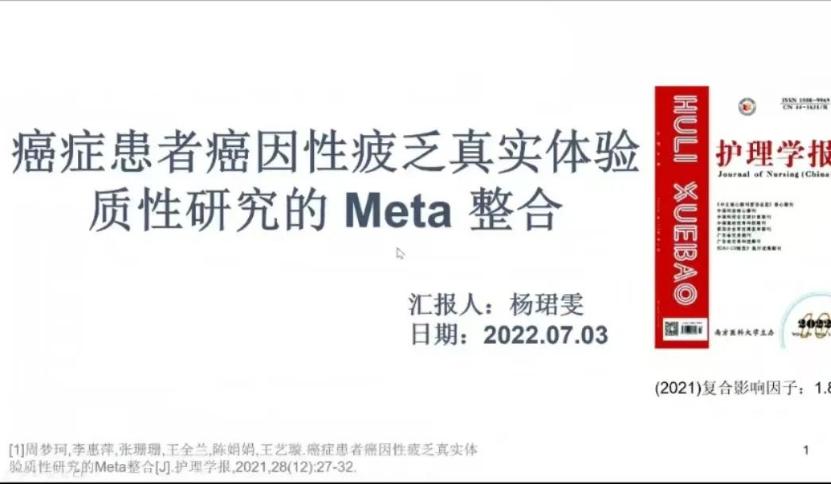 杨珺雯同学做了关于《癌症患者癌因性疲乏真实体验质性研究的Meta整合》的文献分享,通过对癌症患者癌因性疲乏现状的介绍及Meta整合这一概念的解释引出本次分享的主题。文章指出目前国内外虽有相关质性研究,但其研究的关注重点不一,对此,采用汇集性 Meta 整合的方法整合国内外癌因性疲乏相关质性研究结果,旨在临床医护人员制定干预策略提供可靠依据。通过她的分享,同学们了解了meta整合这一写作方法,为日后相关学习和写作提供了很好的思路。