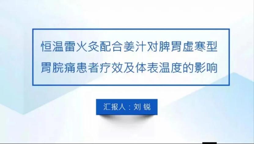 刘锐同学做了关于《恒温雷火灸配合姜汁对脾胃虚寒型胃脘痛患者疗效及体表温度的影响》的文献分享,该研究将80例脾胃虚寒型胃脘痛患者按随机数字法分为恒温雷火灸组和姜汁恒温雷火灸组。在干预前、干预第 7 天和第 14 天观察比较腋温和脾俞、胃俞、中脘、关元、足三里、涌泉等穴位的体表温度。结果表明:恒温雷火灸配合姜汁可显著提高脾胃虚寒型胃脘痛患者临床疗效,同时提高体表温度,改善机体寒性症状。
