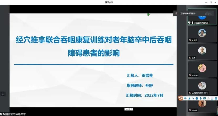 田雪莹同学分享的文献为《经穴推拿联合吞咽康复训练对老年脑卒中后吞咽障碍患者的影响》,文章选取老年脑卒中合并吞咽障碍患者65例,随机分为对照组33例和观察组32例。对照组在脑卒中常规治疗和早期康复锻炼基础上给予常规吞咽功能康复训练。观察组在对照组基础上联合采用经穴推拿治疗。比较患者吞咽功能、日常生活活动能力、误吸发生率、吸入性肺炎发生率、胃管成功拔除率与胃管留置时间。得出经穴推拿联合吞咽康复训练可有效提高胃管拔除成功率,缩短胃管留置时间,改善老年脑卒中后合并吞咽障碍患者吞咽功能和日常生活活动能力。