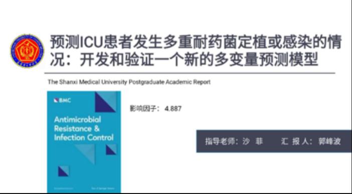 郭峰波同学分享的文献为《预测ICU患者发生多重耐药菌定植或感染的情况:开发和验证一个新的多变量预测模型》,本篇文章以多重耐药菌已成为全球患者发病和死亡的重要原因为背景,通过构建一个易于使用的列线图,来预测ICU患者mdro定植或感染的发生,目的旨在感染发生时为经验治疗提供帮助。